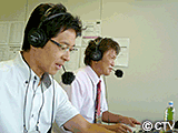 同じく、身振り手振りを交えて東アナにアドバイスする佐藤部長。