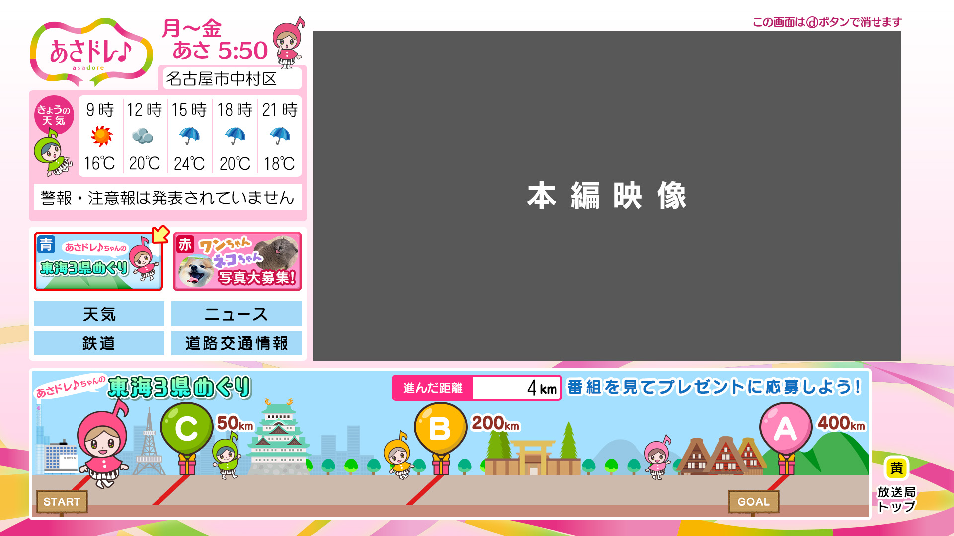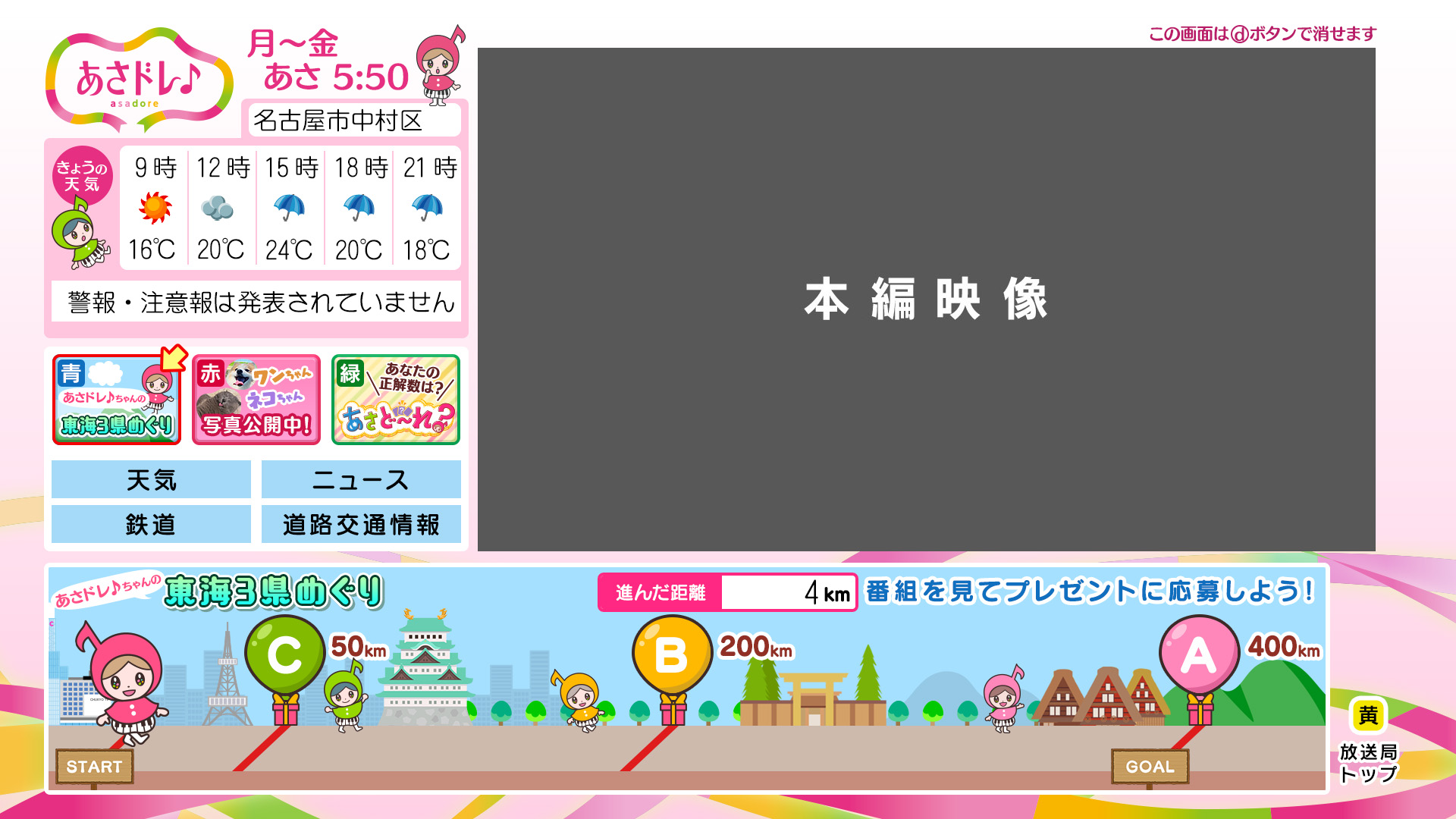 「あさドレ♪」を視聴すると、「あさドレ♪ちゃん」が東海3県を歩いて進んでいくよ。