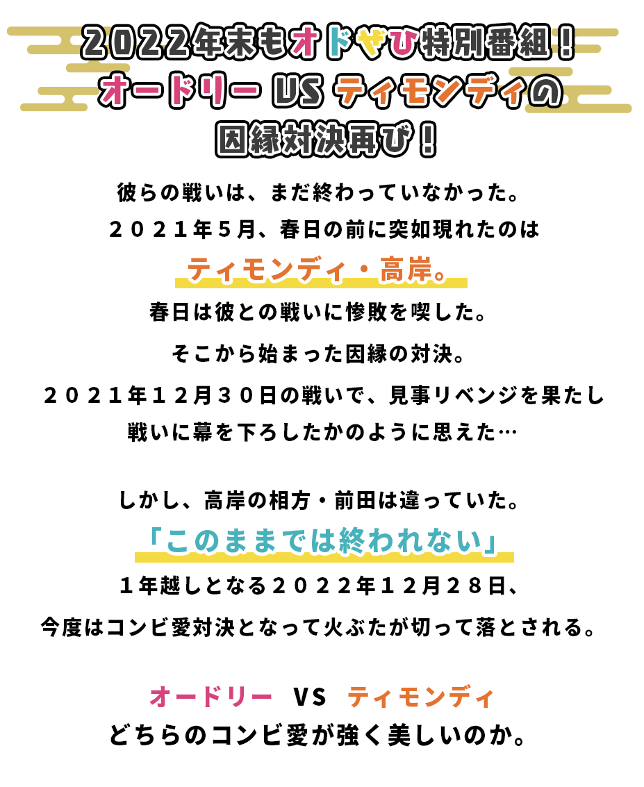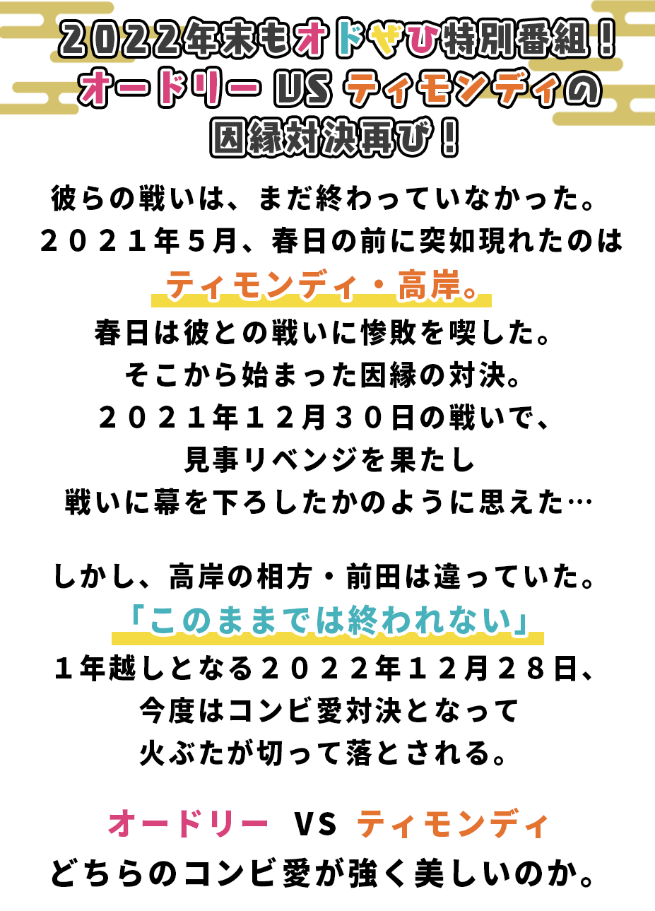 日本を代表するパワー系芸人、春日と高岸が再び相まみえる!各々が強力な助っ人を引き連れてのチーム戦!春日軍団には、ぜひらー総選挙1位の石黒さん&元世界チャンプ大石さん!高岸軍団には、準レギュラースギちゃん&春日の大先輩TAIGA!ここでの最終戦が今回のコンビ愛対決への布石か!?