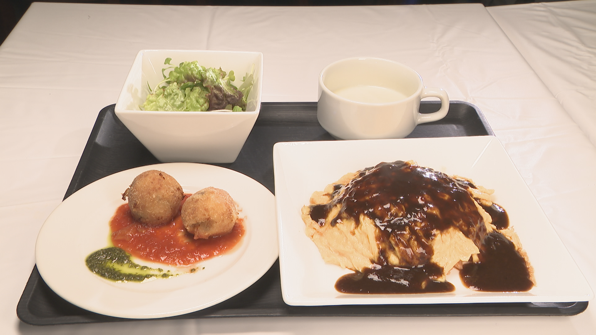 (オムライス、サラダ、日替わりスープ、カニクリームコロッケorマカロニグラタン付き)