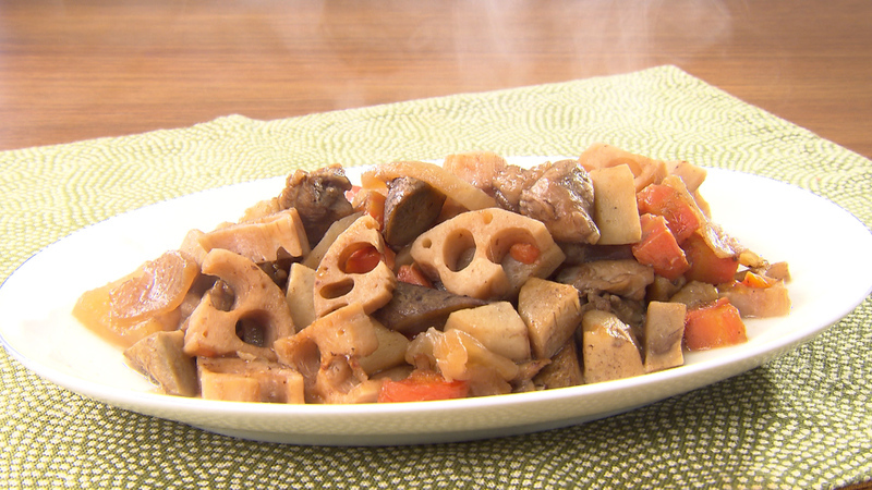 ①ダイコン、レンコン、ニンジンはいちょう切りに、ゴボウは乱切りに、鶏もも肉は一口大に切る