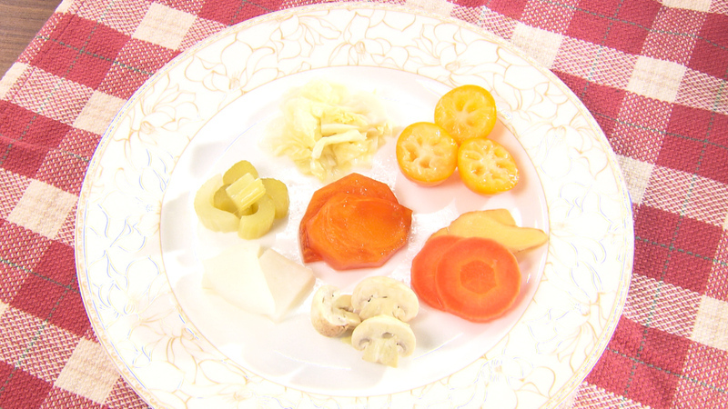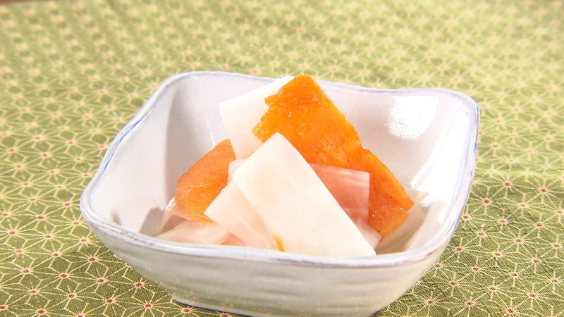 ②冷めた①に好みのサイズに切ったダイコン・柿を浸ける