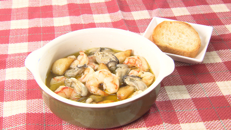 エビ(むき身) 8尾、カキ 130g、ニンニク・塩・オリーブオイル 適量