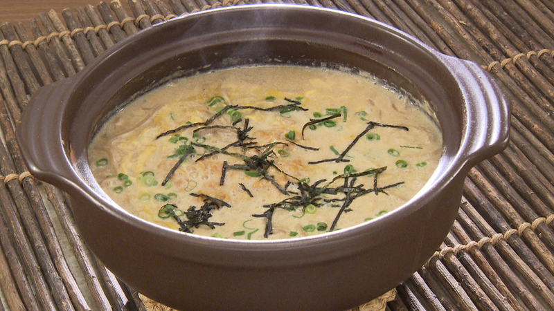 豚肉と白菜のとろみ鍋のスープ、豆乳、そば(茹でたもの)、ひきわり納豆、たまご
