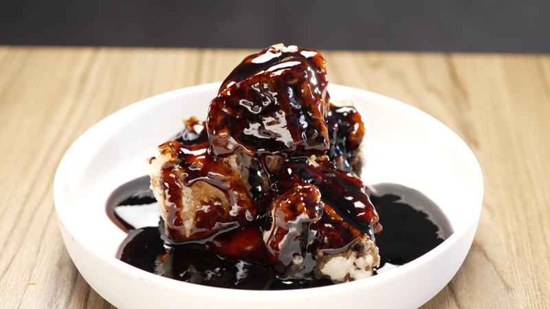 ③ラップを持って卵を半分に畳み、お好みソース、マヨネーズをかけたら完成!