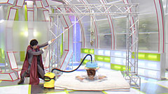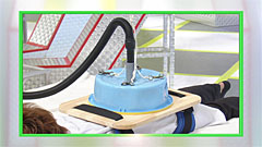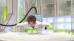 板を背負った人間に掃除機をつないだタライをセットして、スイッチを入れると・・・
