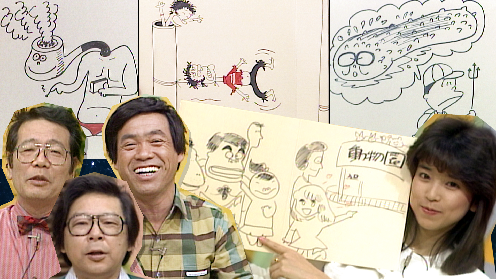 1976年から18年間に渡り放送された伝説のマンガ大喜利バラエティ。柏村武昭,車だん吉,鈴木義司,富永一朗,川島なお美ほか