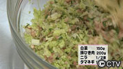 みじん切りにした白菜、ニラ、タマネギと、豚ひき肉を混ぜ合わせて