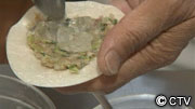 4)をギョーザの皮にのせ、さらに3)をたっぷり盛りつけたら、