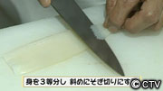 2)を縦に3等分し、2)の切り込みと直角に斜めにそぎ切りにし、