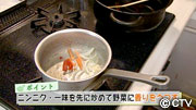 鍋にオリーブオイル、みじん切りにしたニンニク、一味を入れ、