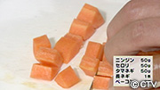 ニンジン、セロリ、タマネギ、長ネギ、ベーコンは1センチ角に切る。