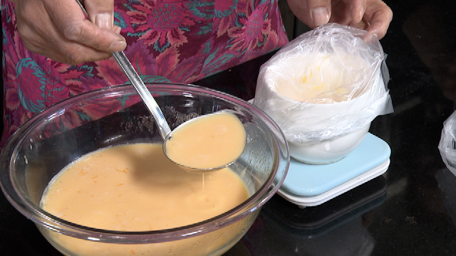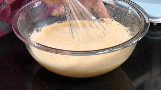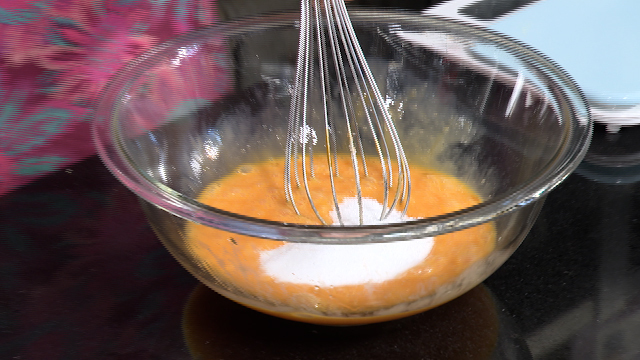 ③白身と黄身を同じ分量になるように分けてから合わせ、上白糖と混ぜる