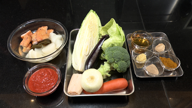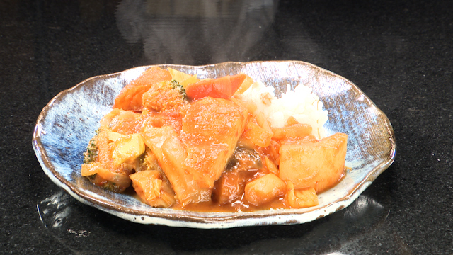 油(適量)・カットトマト(200g)・ショウガ(10g)・顆粒だし(大さじ2/3)・中華だし(大さじ1)・カレー粉(8g)・みりん(大さじ2.5)