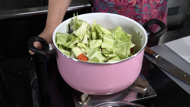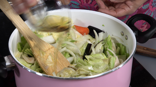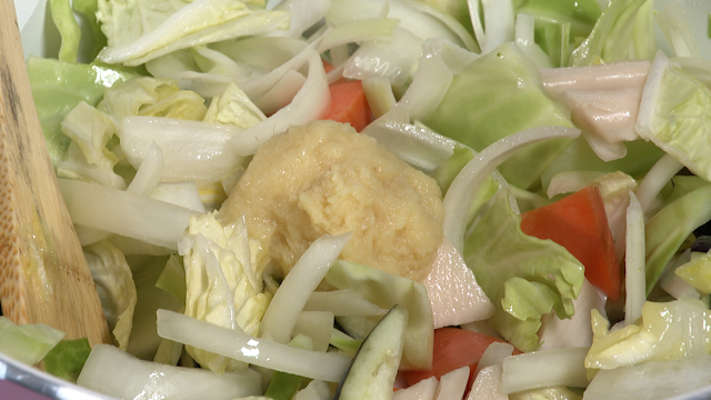 材料:お野菜なんでも(今回はナス1/2本・ニンジン1/2本・ブロッコリー1/2株・白菜1/8個・玉ねぎ1/2個・キャベツ2,3枚・レンコン1/2本)