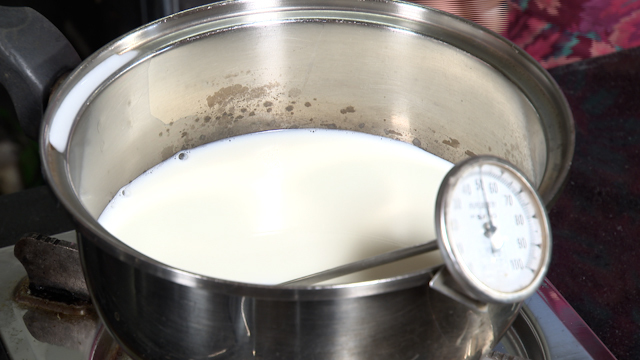 ②牛乳を鍋で温め、50℃になったら火を止める