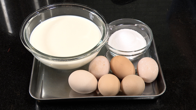 材料:牛乳250ml・たまご3個・上白糖45g・カラメル(上白糖20g・水小さじ1)
