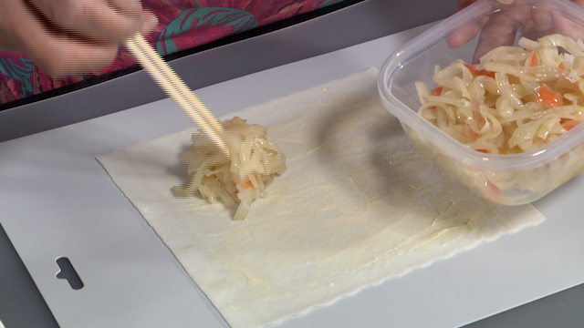①春巻きの皮にマーガリンを塗り、お惣菜を適量のせる