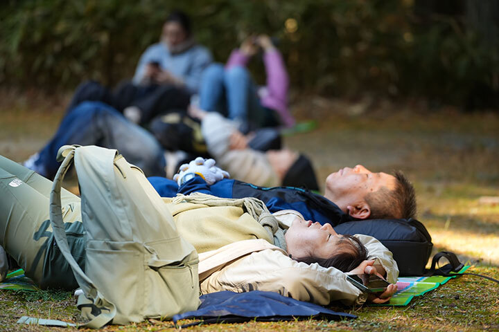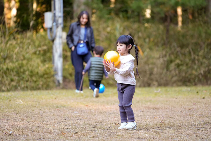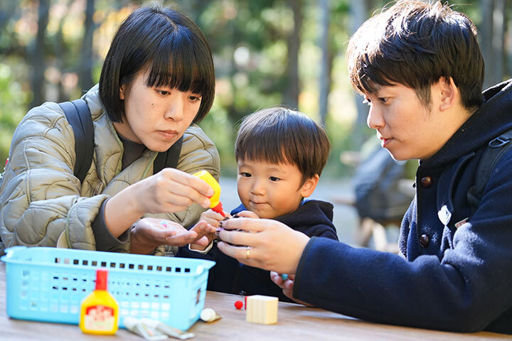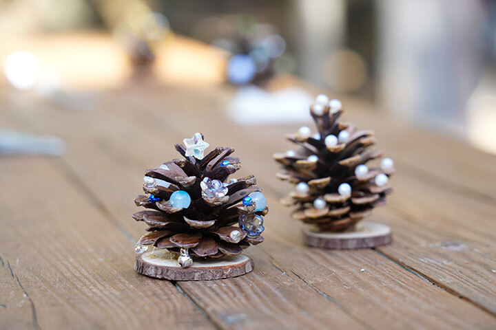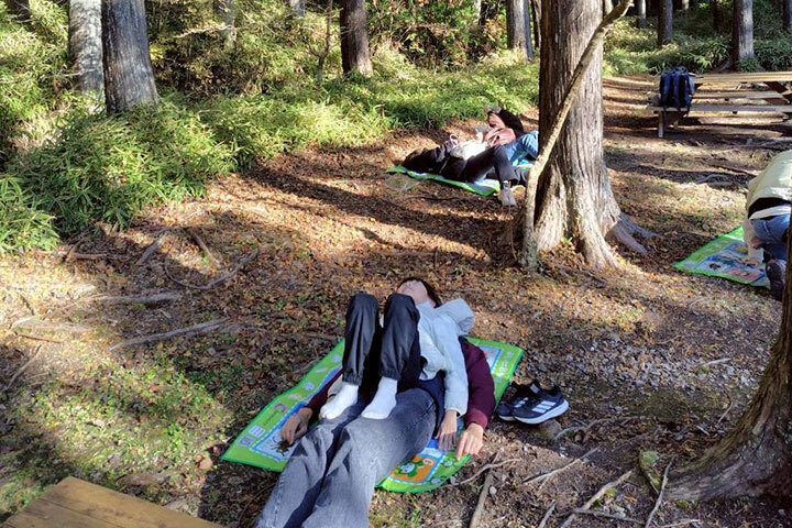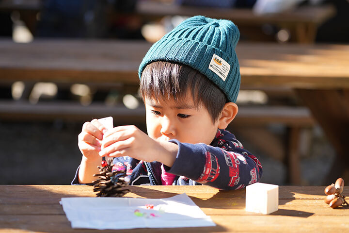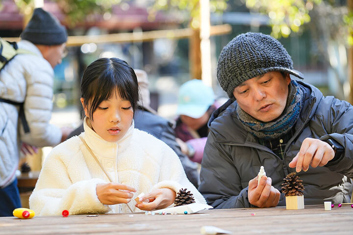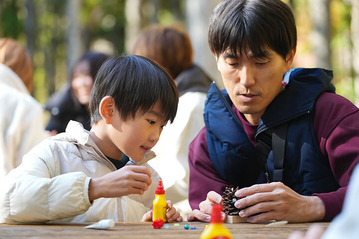森林浴ウォーキングや、自然の素材を使ったまつぼっくりツリーづくり、芝生広場でのモルック等それぞれに分かれて楽しみました。