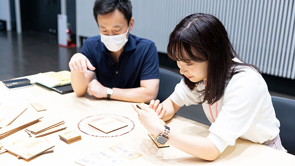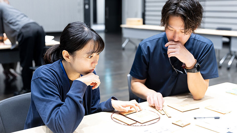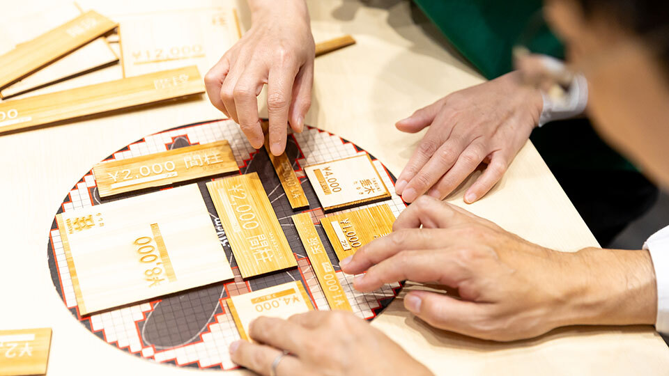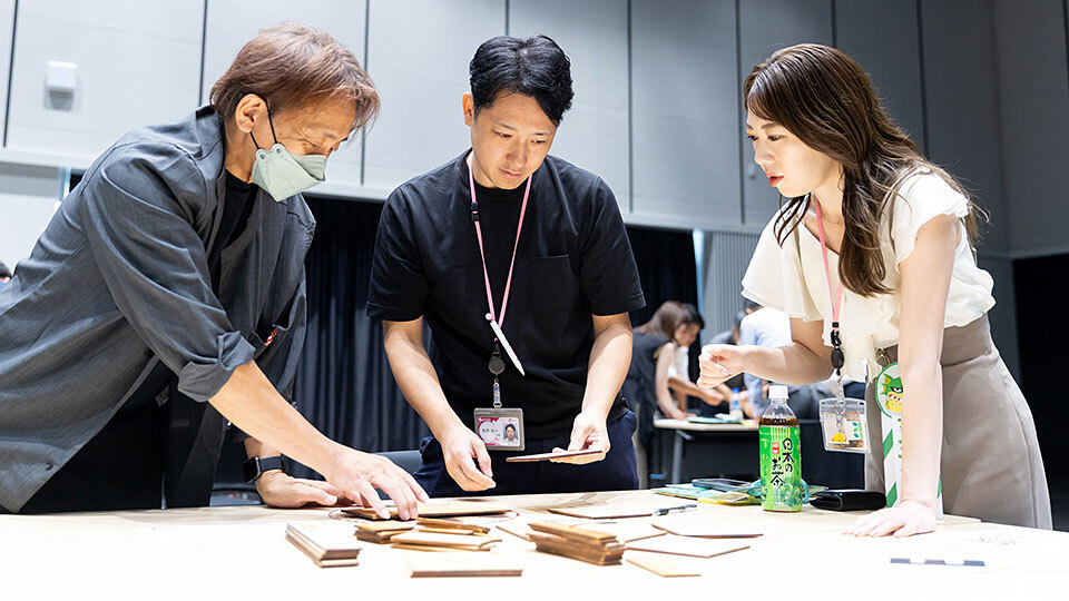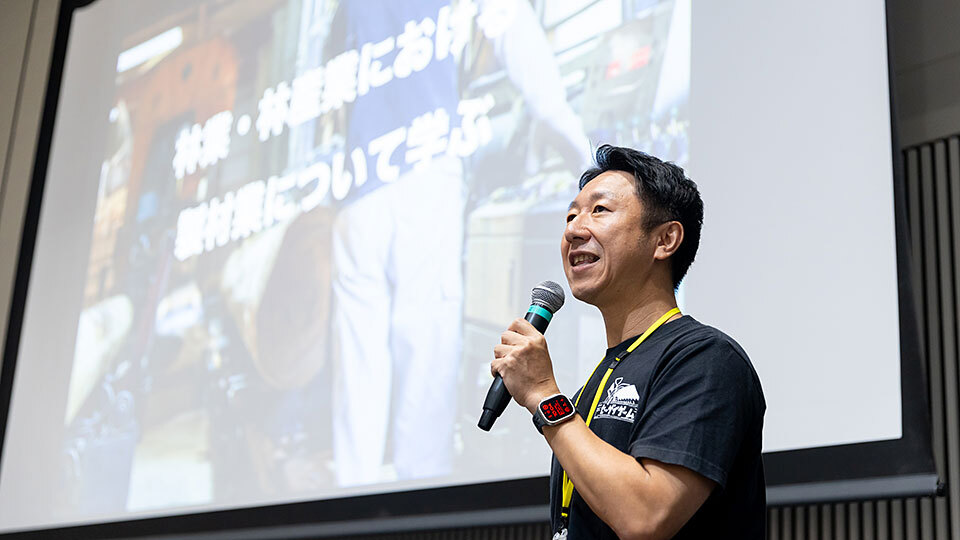 まずは、製材の世界をみんなで勉強。ゲームに必要となる木材の目利きの知識を学び、各チーム別に競りをして、ランクの高い木材を仕入れます。