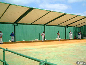 実は、ここはピッチャー陣が投球練習をするブルペンなんです。 今年のキャンプで、山田監督が「楽しみ」と言うほど好調な投手陣は、ここで練習中。