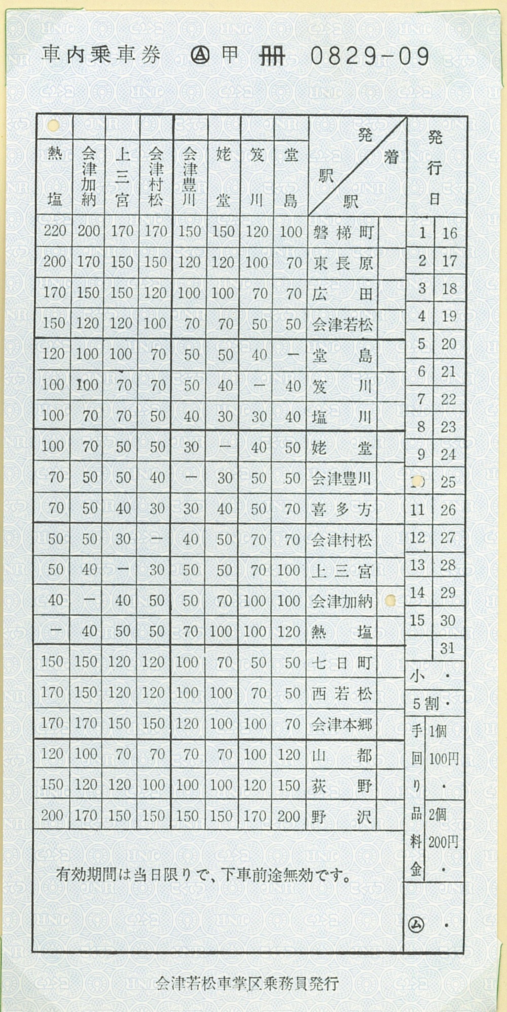 これは昭和51(1976)年の日中線乗車時に購入した車内券。