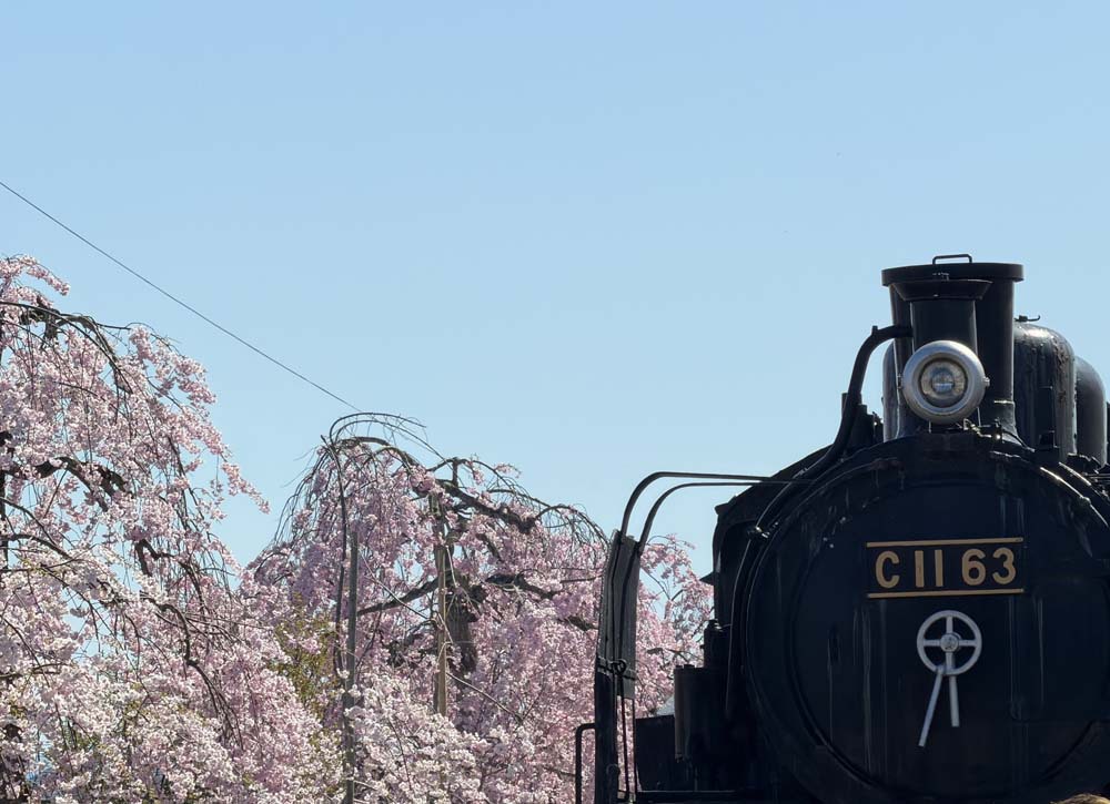 桜色の花と黒い蒸気機関車。見ていてほっこりします。