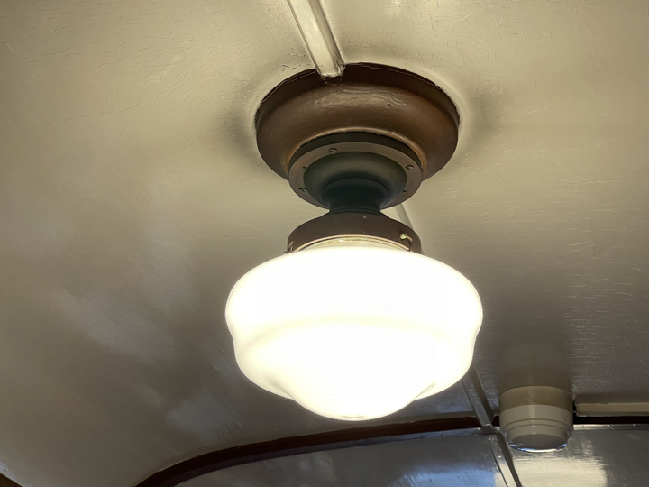 今時の「通勤電車」では、ここまで凝った形の照明カバーはまず見かけません。
