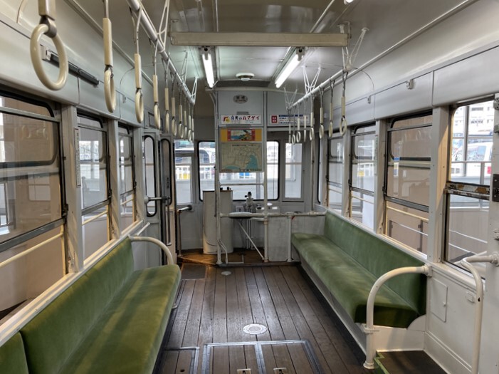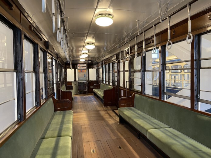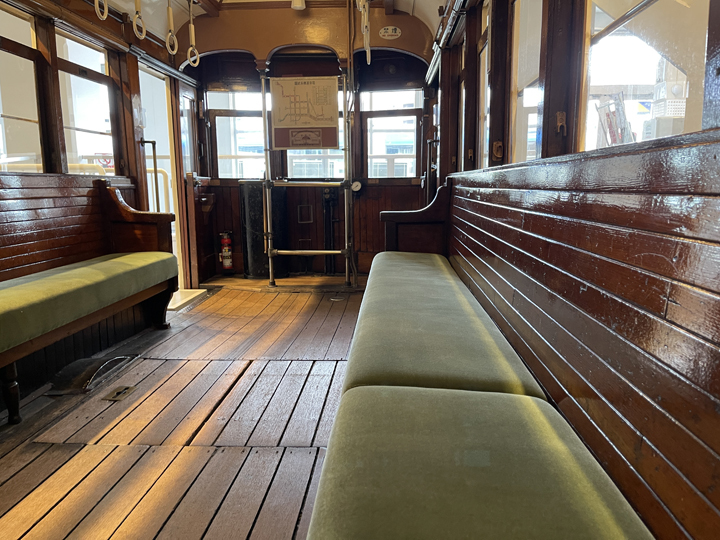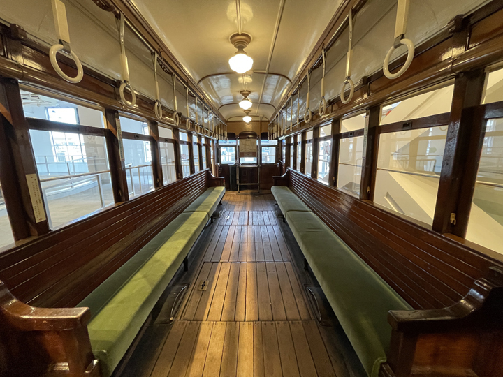 1928(昭和3)年製造の電車。床張りは当時のことなので勿論「木」。「床」はまだれ(部首)の中が「木」なので、文字通りということになります。