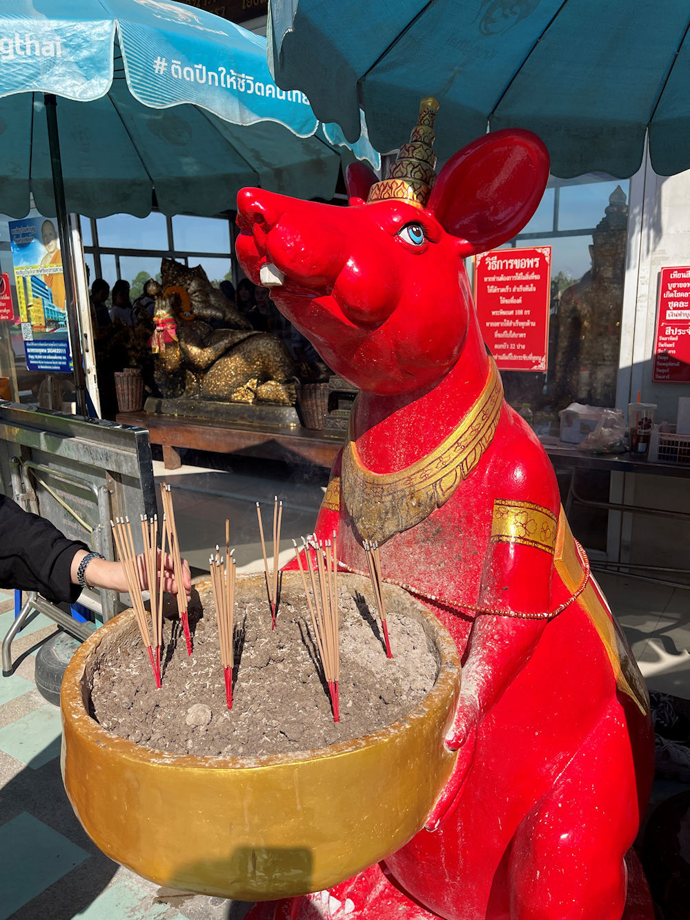 ガネーシャ像の周りには、合計14匹のネズミがいます。各方位に8匹いるほか、ガネーシャ像の手前に2匹いて、この2匹は特殊な能力を持った目と耳(普通では見えない、聞こえないものが見聞きできる)を持っています。また、ガネーシャ像の後方にルーシーネズミ(ルーシーとは、タイ語で仙人、修行者、哲人などを意味)、線香立ての場所にもう3匹いて、特に金運にご利益があるという2つのネズミの像が大変な人気です。