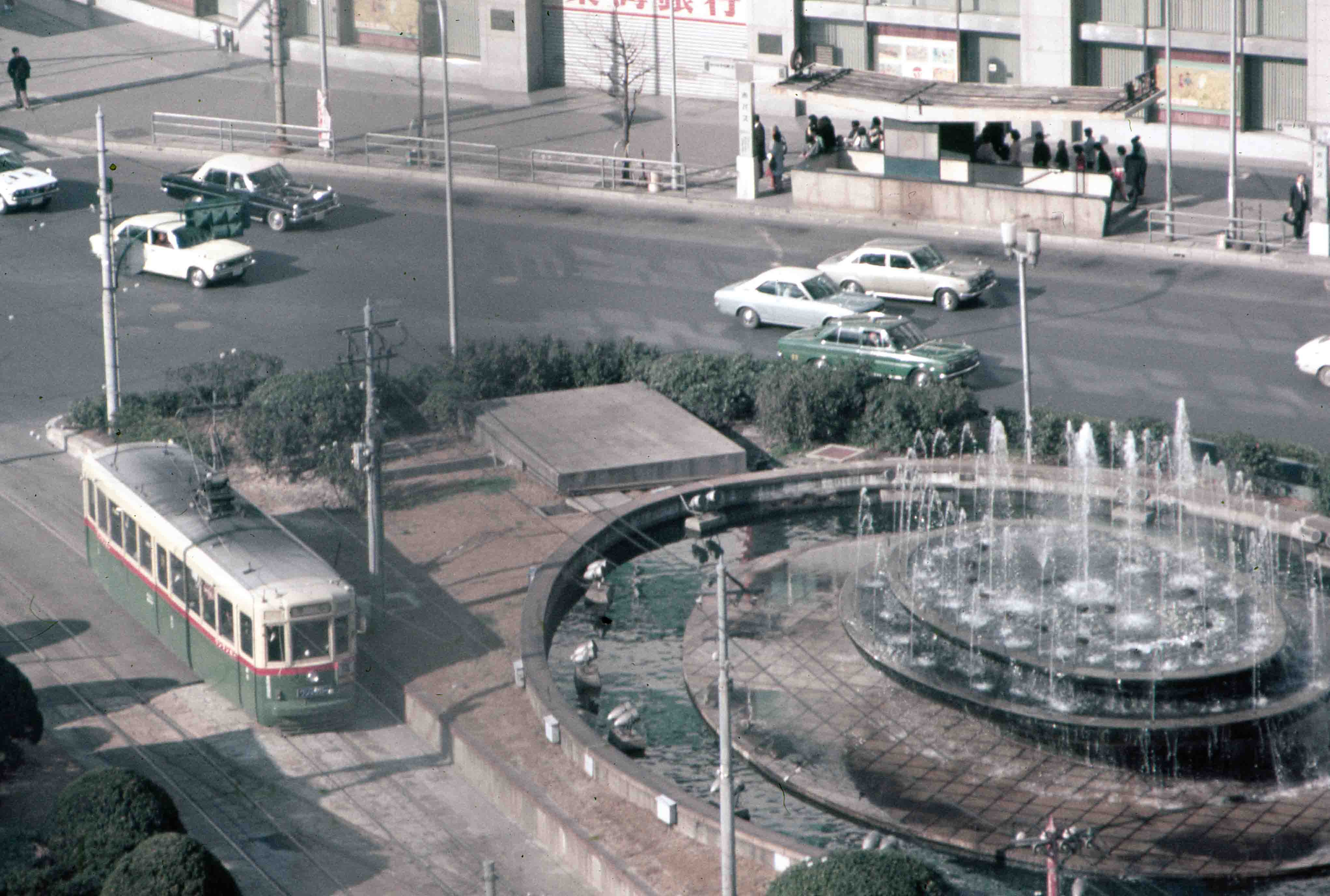 噴水の美しさもさることながら、市電のヘッドライトの光芒(こうぼう)が印象的です。当時のカメラの性能からして、かなりの努力の成果だと思います。