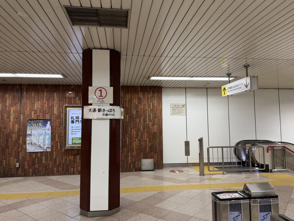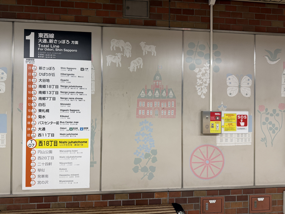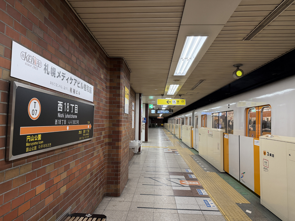 西18丁目駅。壁面の全面タイルは円山公園駅と同様ですが、色が異なります。