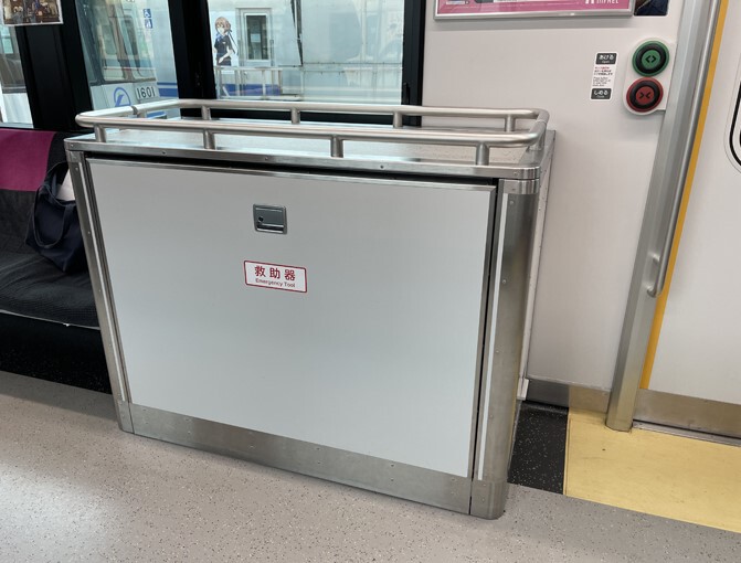 車内にある「救助器」と書かれたボックス。この中に脱出シューターが入っています。