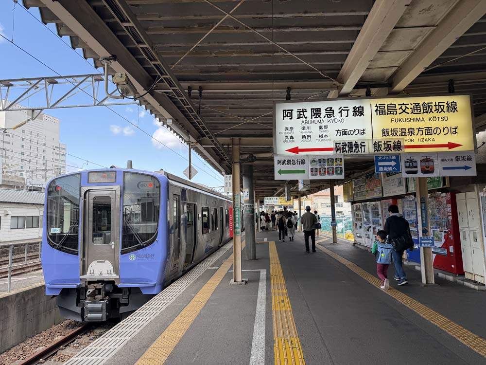 梁川駅にて上下線がほぼ同時に出発する、期待の新車両をぜひご覧ください。