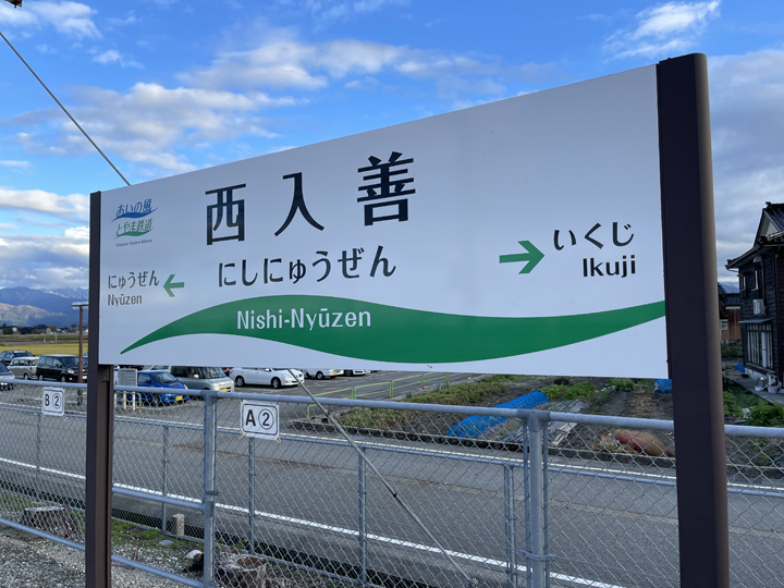 こちらは同じ西入善駅でも富山駅方面の駅名標。