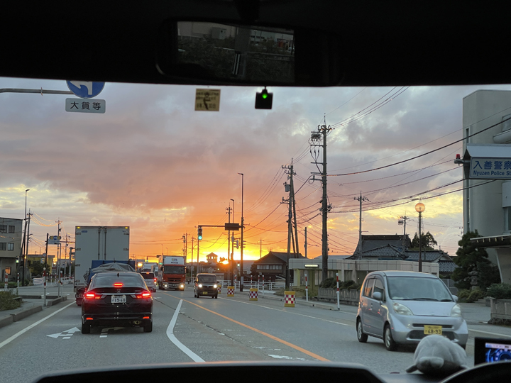 数年ぶりの再会を終え、名古屋に戻る車にしばし同乗。16:35、燃えるような夕日に向って車は走ります。