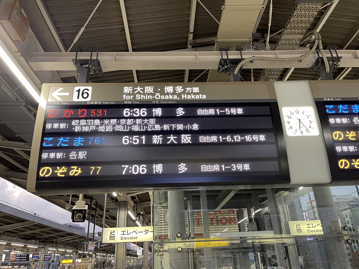 乗車したのは06:36発のひかり531号博多駅行き。名古屋駅から博多駅に向かう場合、途中でのぞみ号(みずほ号にも)に抜かれることがない唯一の直通速達ひかり号で、ジパング倶楽部利用時では、最短時間で到着出来る便利な列車です。ただ難点は朝が早いこと。