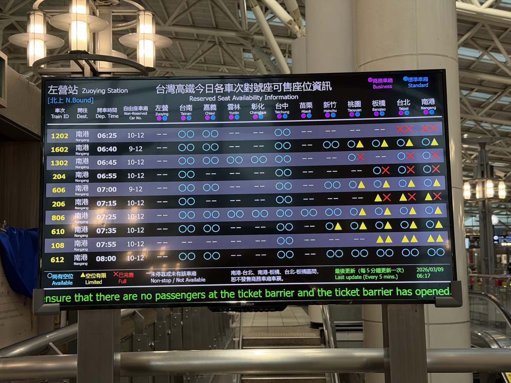 発車案内をご覧あれ。台中までは指定席はあるものの、そこから先の普通車指定席は空席無しもしくは残り少し。