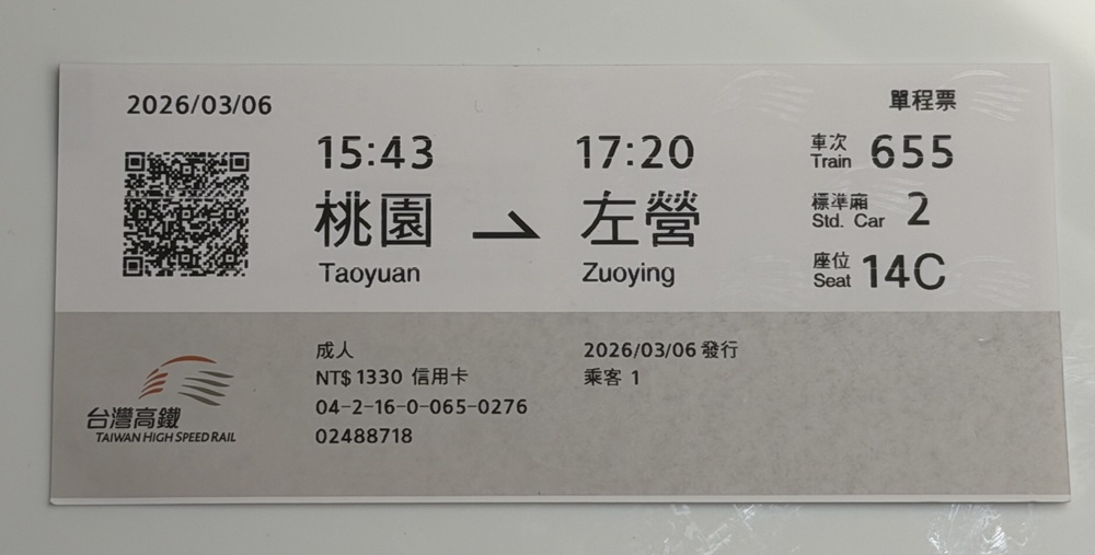 高鉄桃園駅にて台湾新幹線/台灣高速鐵路(高鐵)の「高鐵桃園」発「左営/左營」(高雄)行きの指定席の乗車券で取れたのは15:43発。