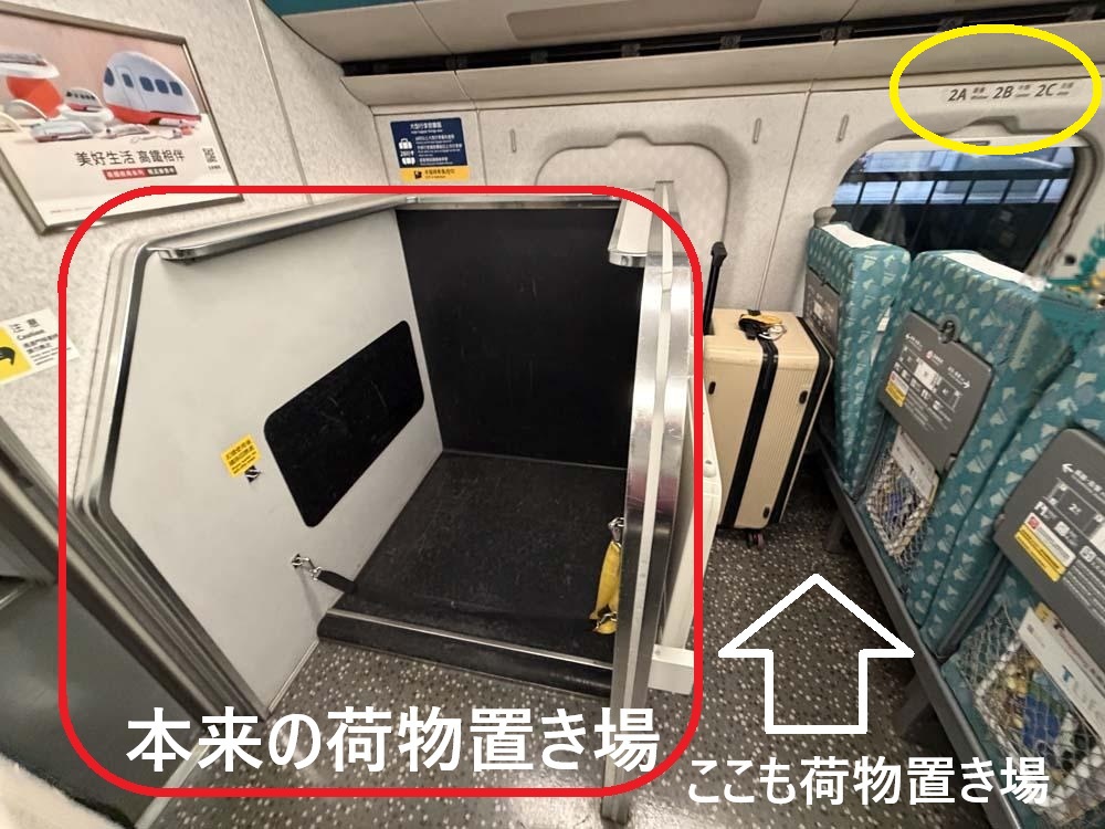 で私の乗車時、すでに荷物置き場は一杯で、トランクを網棚に載せようかと思っていたら、たまたま居合わせた乗務員さんから「2」の後ろのスペース(乗車時には空っぽだった)に置くように案内され、それで転がらないように横置きにしようとしたら縦置きのままで良いとのこと。