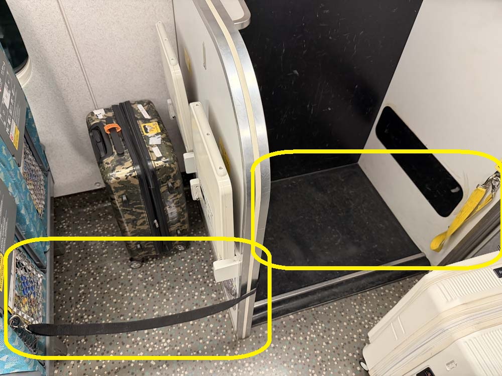 そこで注目なのが荷物が通路に転がり出ないようにベルトが用意されていること。それも「2」列後方にもベルトがあります。