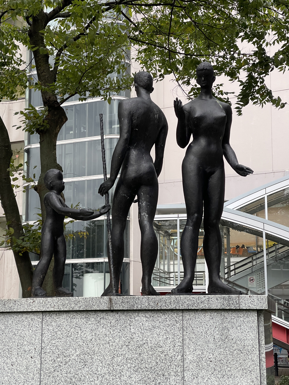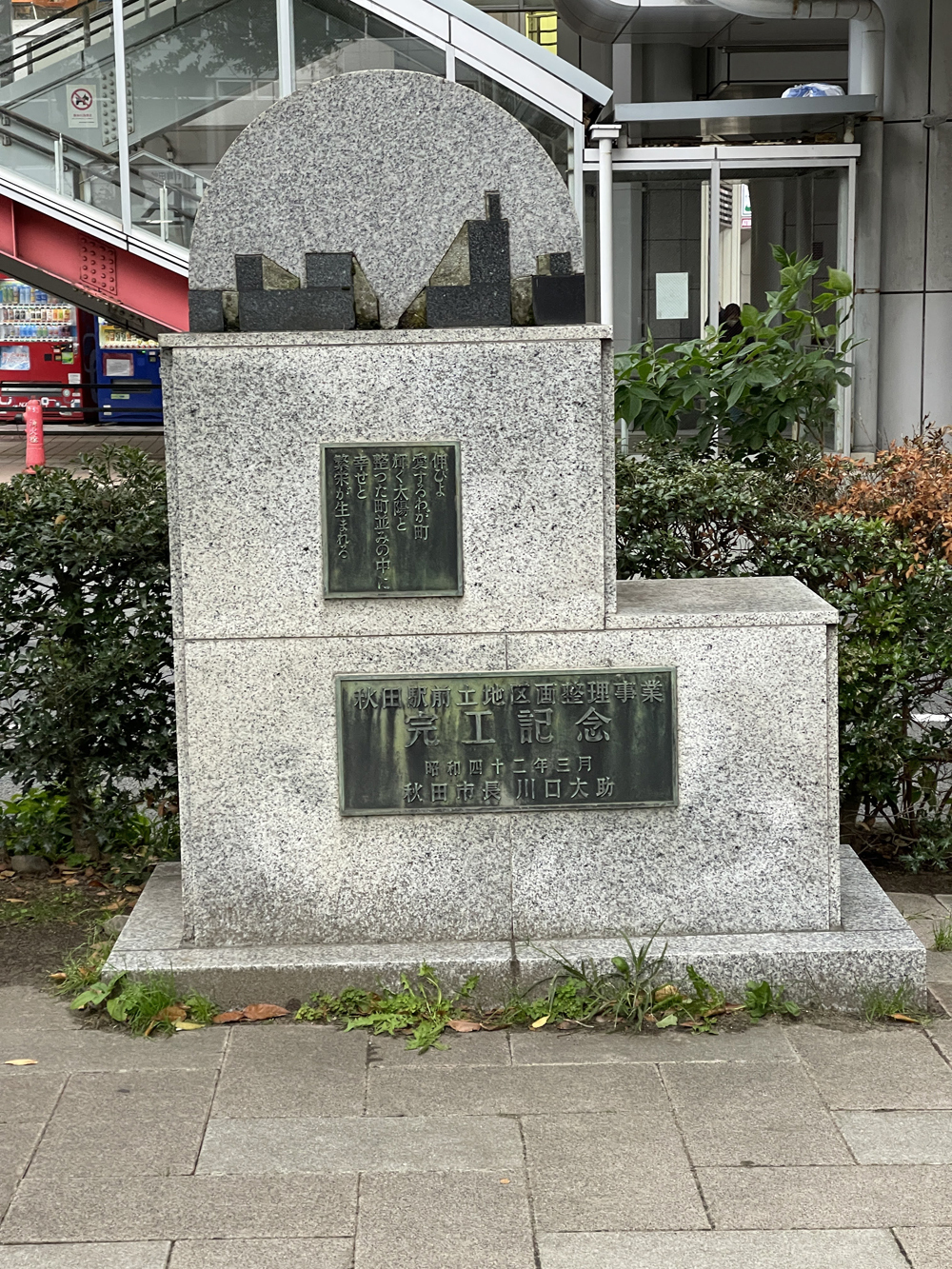 モニュメント「秋田駅前土地区画整理事業 完工記念 昭和42年3月 秋田市長 川口大助」。