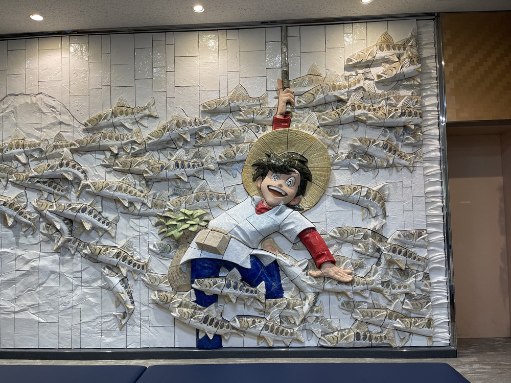 「釣りキチ三平・山魚女群泳」。陶飯のレリーフ。