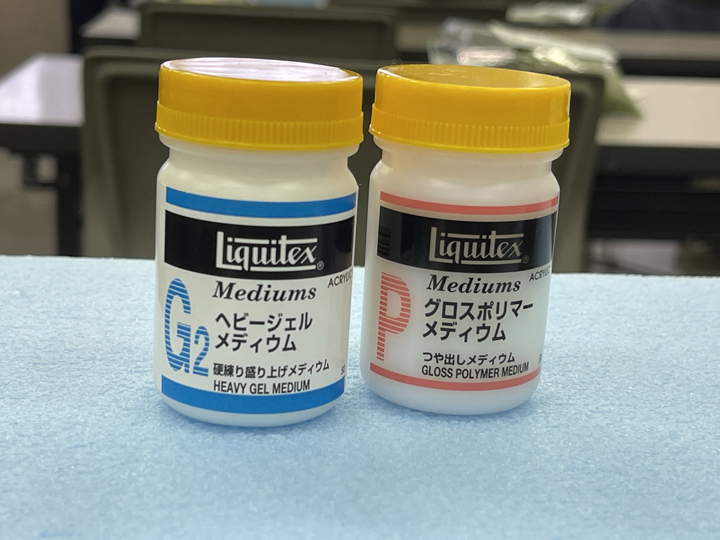 今回は川を表現するのですが、それに使うヘビージェルメディウム、グロスポリマーメディウム。つや出しに使う絵具とのことですが、固まると透明になるのでジオラマ製作でもよく使われているとの説明がありました。多分、次々回あたりで使うことになりそう。