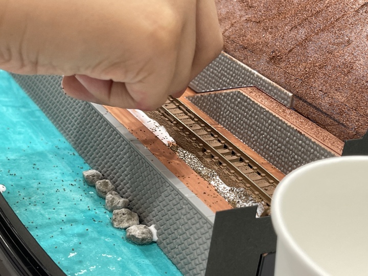 線路の横に接着剤を塗り、そこに「バラスト」と置いていきます。本人、多分バラストが何かはあまり分かっていない。