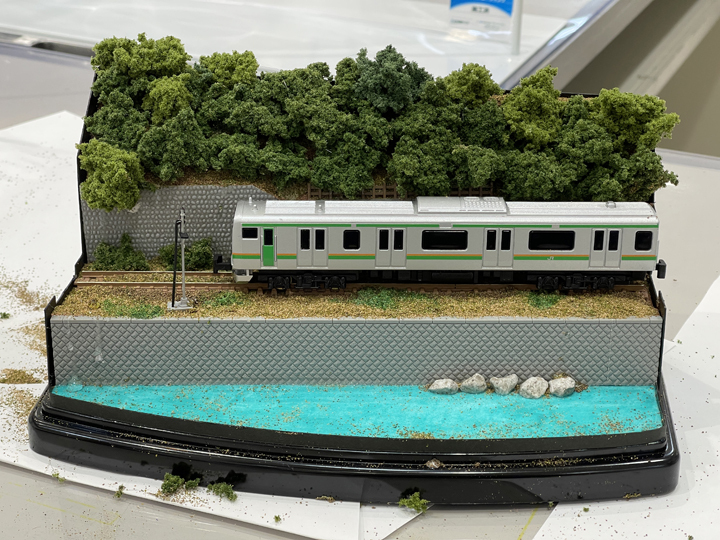 川の中に落ちたパウダー類はまだそのままですが、山の緑とバラスト周りが出来て完成!持ってきた模型を置いてみる。E231系は東京~熱海間で乗ってきた電車。