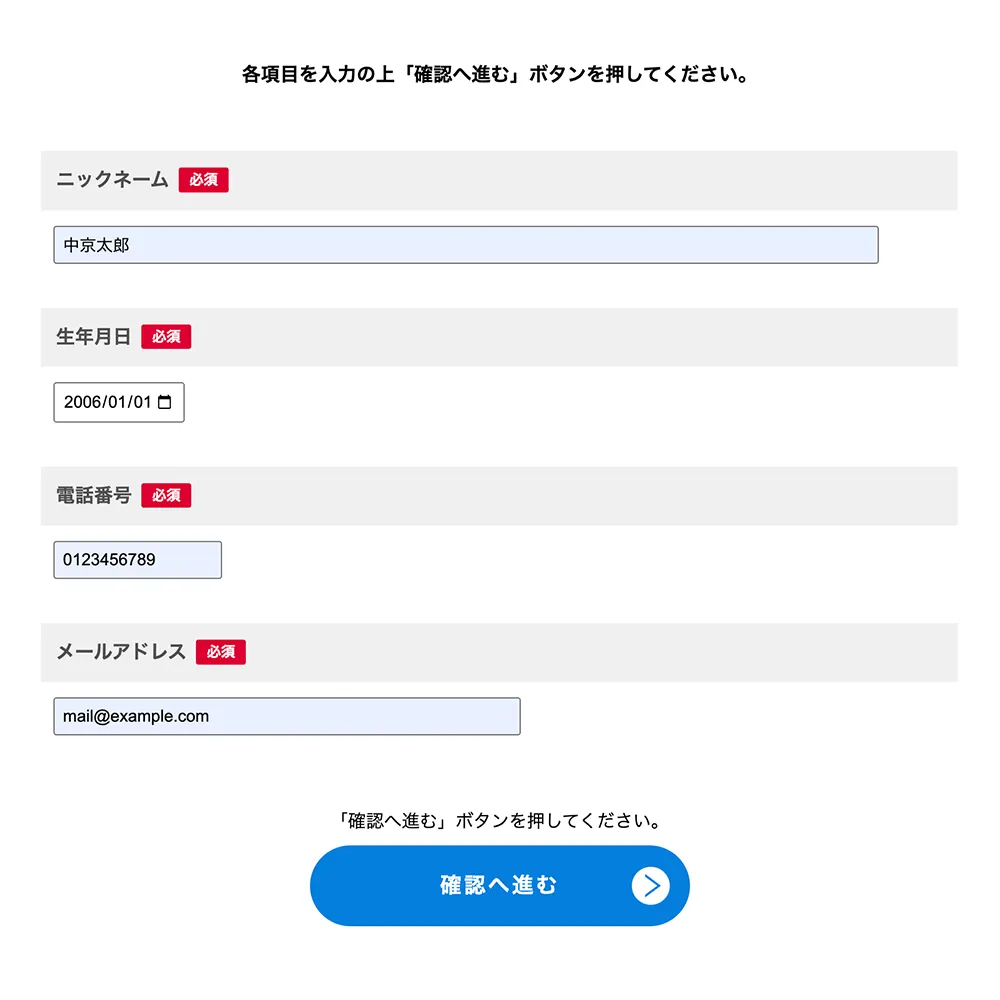- 本人確認のため、ニックネームと生年月日を再度入力する欄があります。