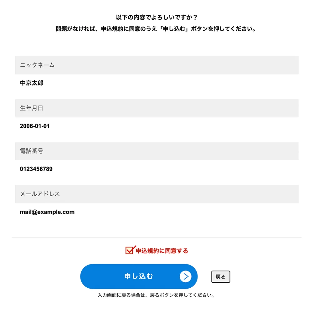 - ②ニックネーム/生年月日/電話番号/メールアドレスを入力し、申し込みまで進めます。