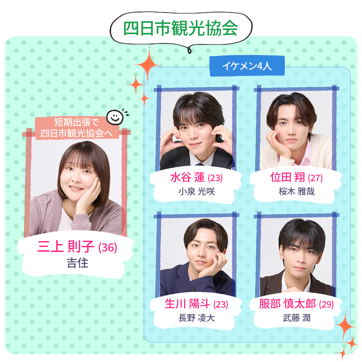 付き合っていたイケメン彼氏が実は、お金目当てのクズ男だったことが判明しイケメンがトラウマになってしまった則子は、ある日、観光協会のお手伝いで四日市にやって来ることに!すると、職場にはなんと4人のイケメンがズラリ!